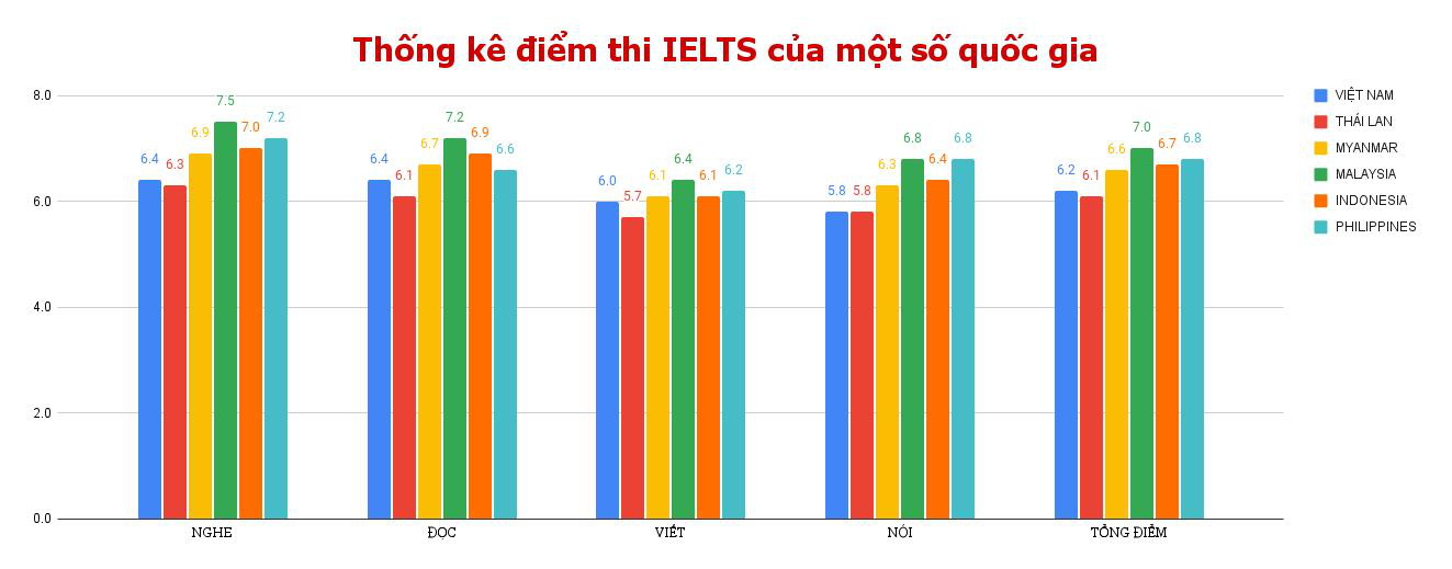 Điểm trung bình kỹ năng viết (writing) của thí sinh Việt Nam là 6.0. Trong khi kỹ năng nói (speaking) thấp nhất trong số 4 kỹ năng, đạt trung bình 5.8.