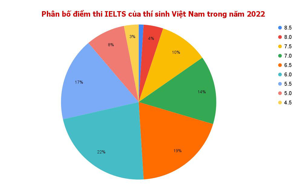 Ban tổ chức IELTS có thống kê tỉ lệ phần trăm điểm số của thí sinh Việt Nam tham gia kỳ thi trong năm 2022. Theo đó, các thí sinh Việt Nam giành nhiều điểm nhất là 6.0, với tỉ lệ 22%.
